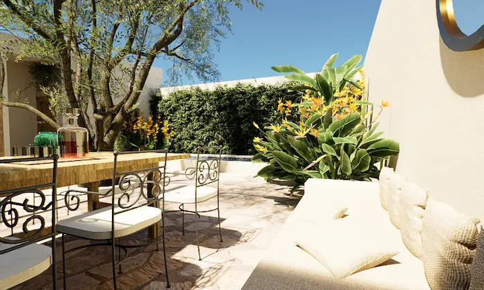 Cada elemento fue cuidadosamente seleccionado para invitar al descanso, la introspección y la conexión con el entorno. El resultado es un oasis urbano que combina funcionalidad ecológica, estética mediterránea y evocación cultural. Un rincón de serenidad que ofrece una pausa emocional en medio del dinamismo de la ciudad.
