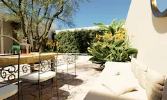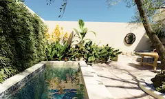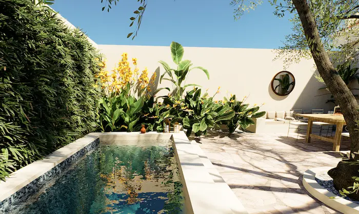 El proyecto gira en torno a un majestuoso olivo, símbolo de sabiduría y longevidad, que aporta sombra y calma. La paleta vegetal incluye especies resistentes como la Canna indica y la Strelitzia reginae, elegidas por su carácter escultórico y tolerancia a climas secos. Sus colores vibrantes contrastan con el azul profundo de los azulejos que enmarcan la piscina, generando un juego cromático que transforma el patio en un refugio íntimo.