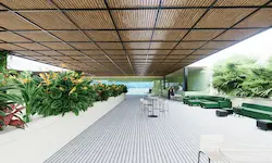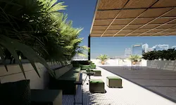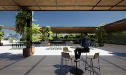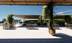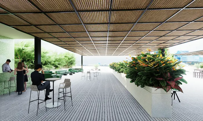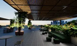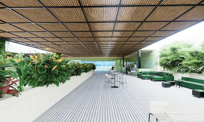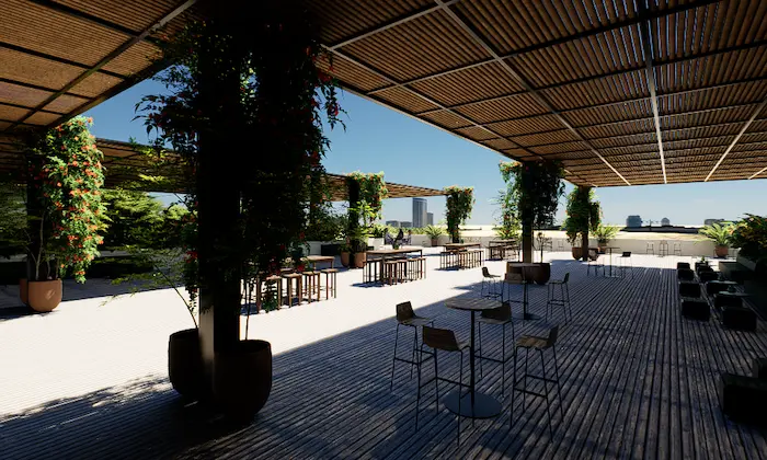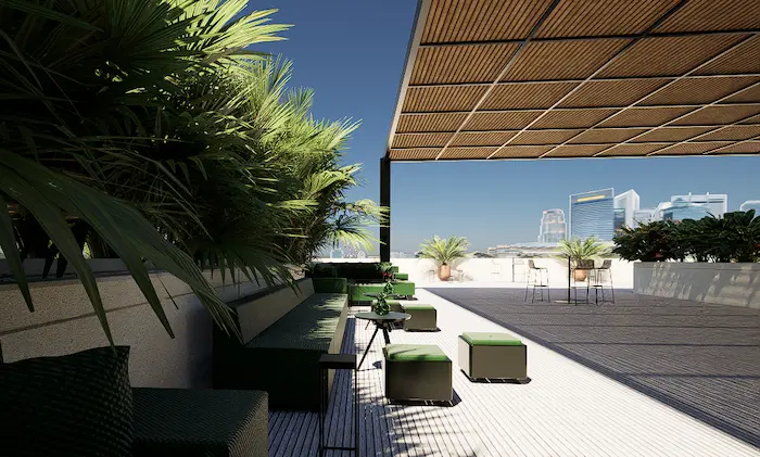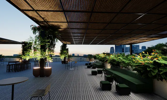 Un rooftop contemporáneo que transforma el techo del hotel en un destino vegetal exclusivo para socializar y relajarse.